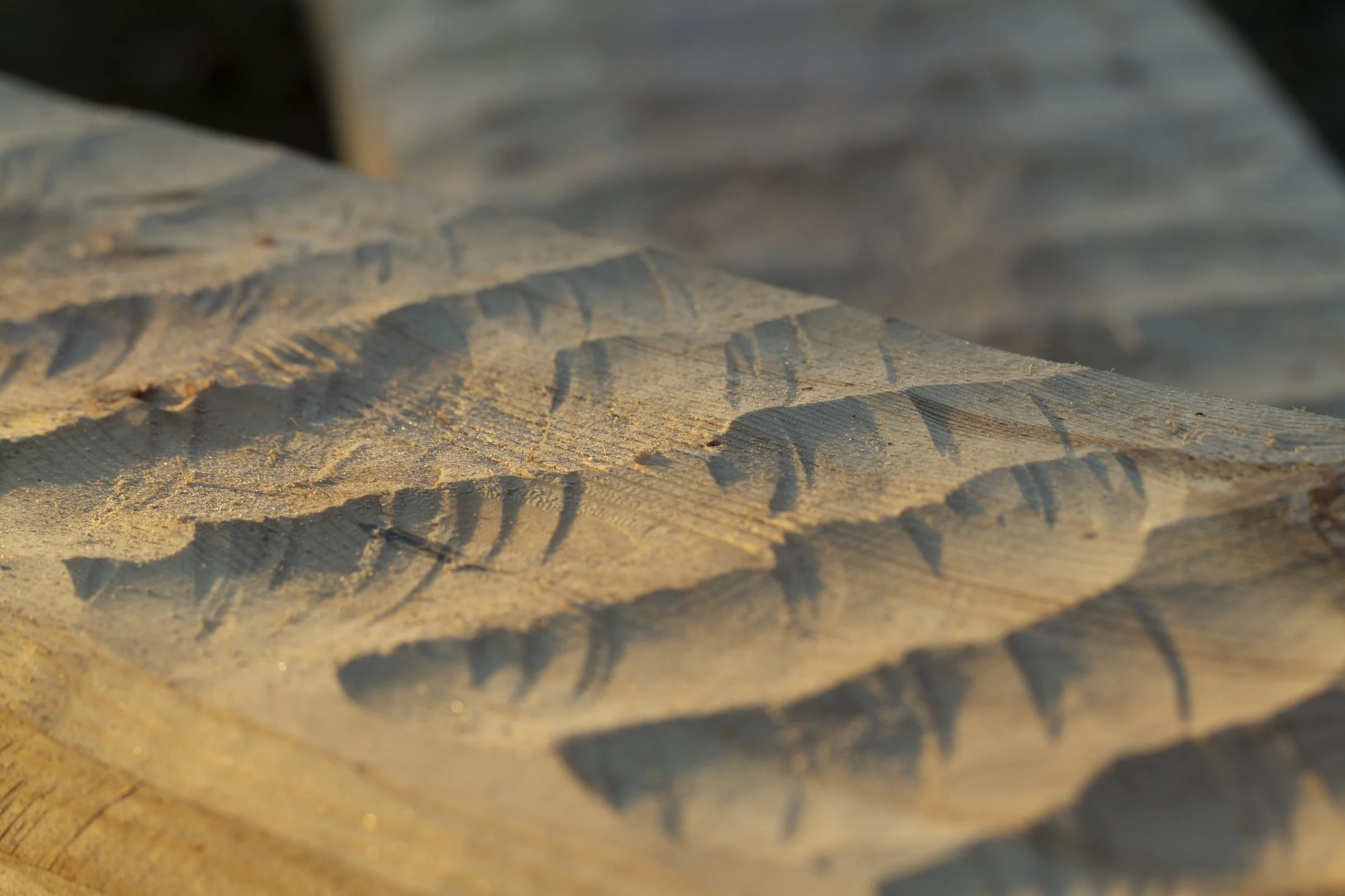 Byggnaderna på en finsk bondgård är traditionellt uppförda av stockar. Därför var det självklart att jag på utställningen ville presentera mina alster på inhemsk plywood. Björkfanéret är behandlat med vitt bläck på vilket fotografierna är tryckta. Träets levande struktur lyser igenom, vilket är en faktor som inverkar på slutresultatet. Den effekten kan fotografen inte påverka.